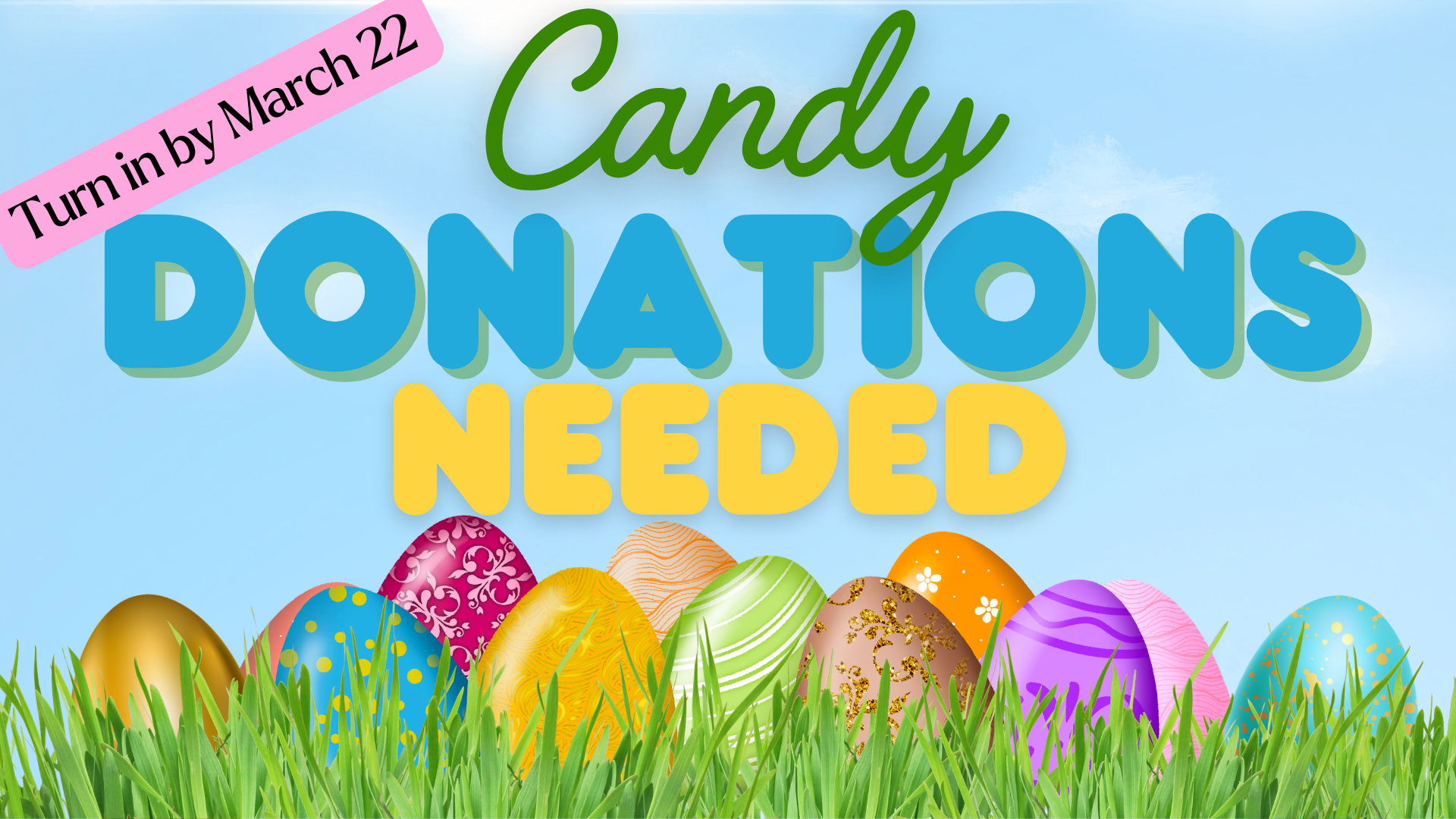 The 5th annual Easter Egg Hunt is fast approaching! If you would like to help, we are collecting individually wrapped candy that will fit easily in Easter Eggs for the Event. Please bring the candy to the information counter or drop it by the church office by March 22nd!