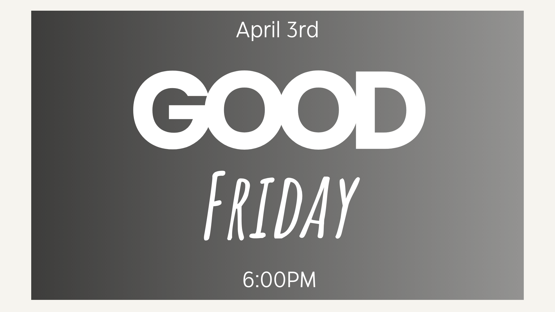Good Friday Service Come join us Friday, April 3rd, at 6:00PM for our Good Friday service. This will be a night of worship, scripture, and communion. Childcare will be offered for nursery and preschool age only. + Add to Google Calendar + iCal / Outlook export 00 days 00 hours 00 minutes 00 seconds Date Apr 03 2026 Time 6:00 pm - 7:00 pm Category Adults Featured Men Women Young Adults Share this event