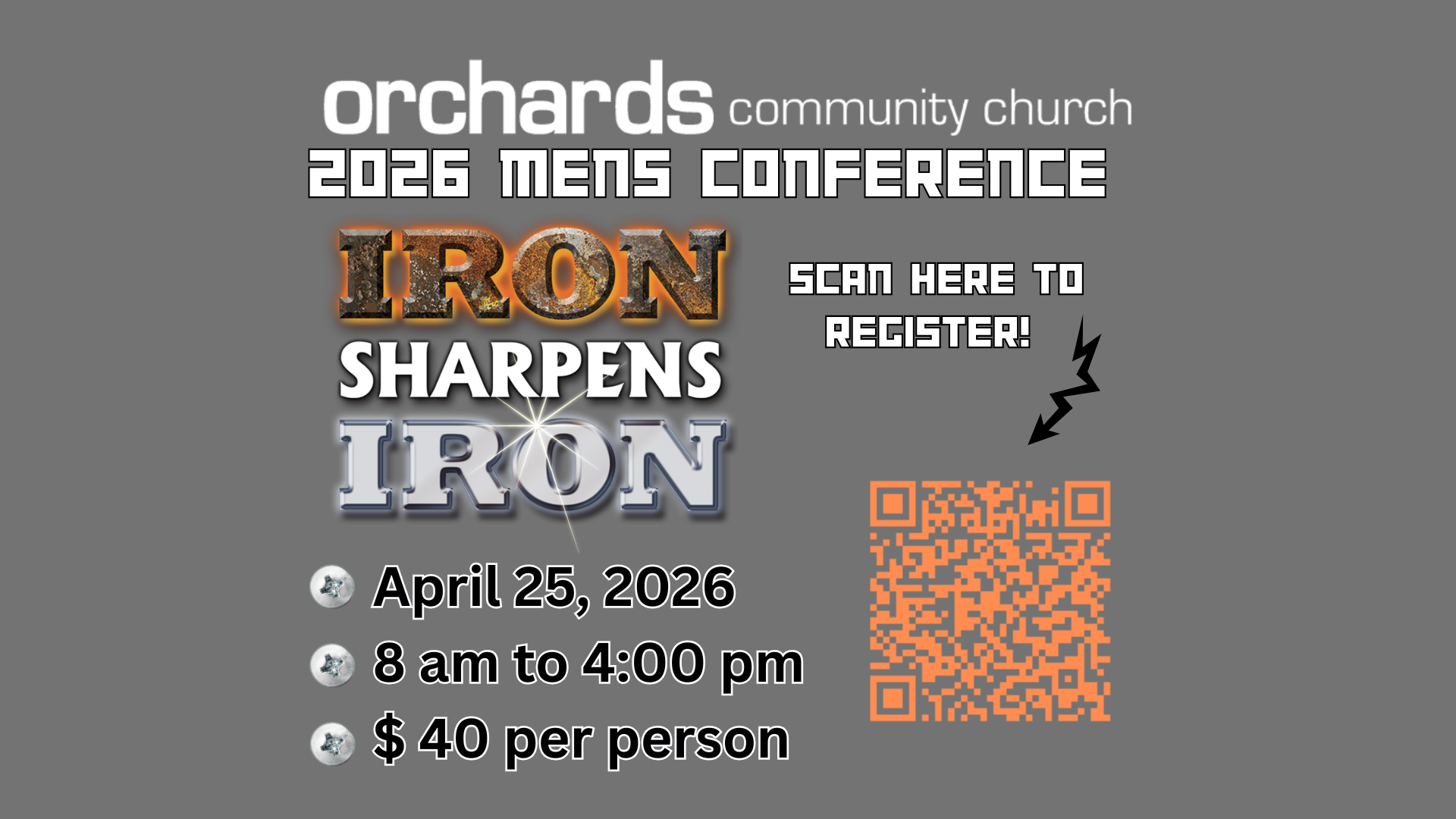 Join us for our 1st Annual Iron Sharpens Iron Spring Conference! This is a day for men to grow in faith and connection through powerful keynotes and specialized breakout sessions led by our Pastoral Staff.